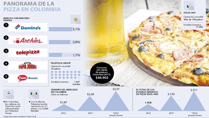 En Colombia, el mercado correspondiente a este alimento movió durante el año pasado $2,3 billones gracias a los 2.133 establecimientos que comercian este producto. Por persona el consumo de pizza representó $46.901 durante el año pasado. Se espera que para 2022 existan 2.311 locales de pizza en el país y que el consumo de este producto movilice $2,57 billones en el mercado nacional.