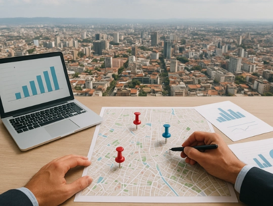 Una vez identificada una ubicación potencial, el siguiente paso es analizar el mercado para validar la oportunidad y dimensionar la demanda real. El proceso parte por delimitar el área de influencia, evaluando densidad poblacional, características socioeconómicas y patrones de movilidad. Con esa base, se calcula el potencial de ventas a través de dos enfoques complementarios: el método top-down, que estima el gasto total disponible en la zona (población × gasto per cápita × frecuencia de visita), y el método bottom-up, que proyecta las ventas promedio por metro cuadrado según categoría de tienda, con base en benchmarks locales e internacionales.