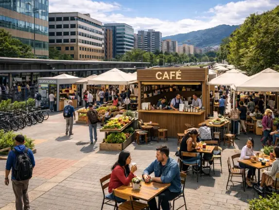 Un segundo grupo de usos con alto potencial es el de alimentos y bebidas en formato ligero, con una condición no negociable: operación limpia, infraestructura liviana y manejo impecable de residuos. La Séptima ya tiene oferta gastronómica y, por eso, el criterio no debe ser “más comida”, sino “mejor experiencia para el paso”. Café, panadería liviana, opciones rápidas y de bajo impacto son compatibles con una fase temporal si se diseñan como micro-espacios de pausa breve, sin cocinas pesadas ni procesos que generen humo, ruido o residuos complejos.