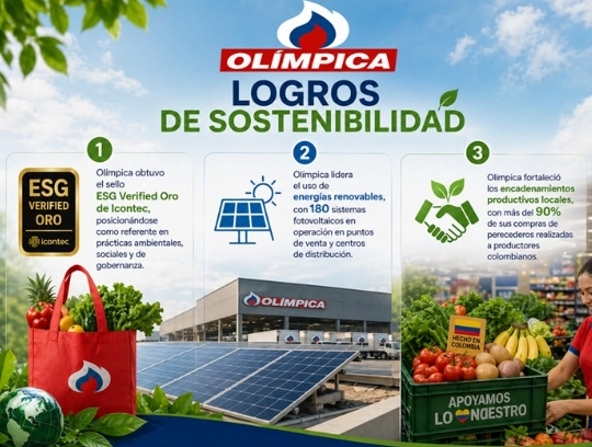 La sostenibilidad se ha consolidado como un eje estructural del modelo de negocio. Olímpica obtuvo el sello ESG Verified Oro de Icontec, posicionándose como referente en prácticas ambientales, sociales y de gobernanza. Entre sus principales avances destaca el liderazgo en el uso de energías renovables, con 180 sistemas fotovoltaicos en operación en puntos de venta y centros de distribución, que representan aproximadamente el 35% del consumo energético de estas unidades.