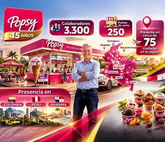 El proceso de internacionalización ha sido coherente con esa visión: crecer con propósito y con una operación capaz de replicar estándares. Carlos describe el ecosistema corporativo de Popsy como una imagen de crecimiento contundente: un emprendimiento que arrancó con nueve personas —dos en fábrica, cinco en heladería y sus padres Álvaro y Elena— y que hoy cuenta con 250 puntos de venta. Esa evolución se traduce en un grupo de 2.200 personas en Colombia. A eso se suma la operación internacional, con presencia en Panamá (cerca de 20 años) y Perú (13 años), que agrega algo más de 1.000 personas. En total, el grupo ronda las 3.300 personas y está presente en cerca de 75 ciudades en la región, de las cuales 52 están en Colombia.